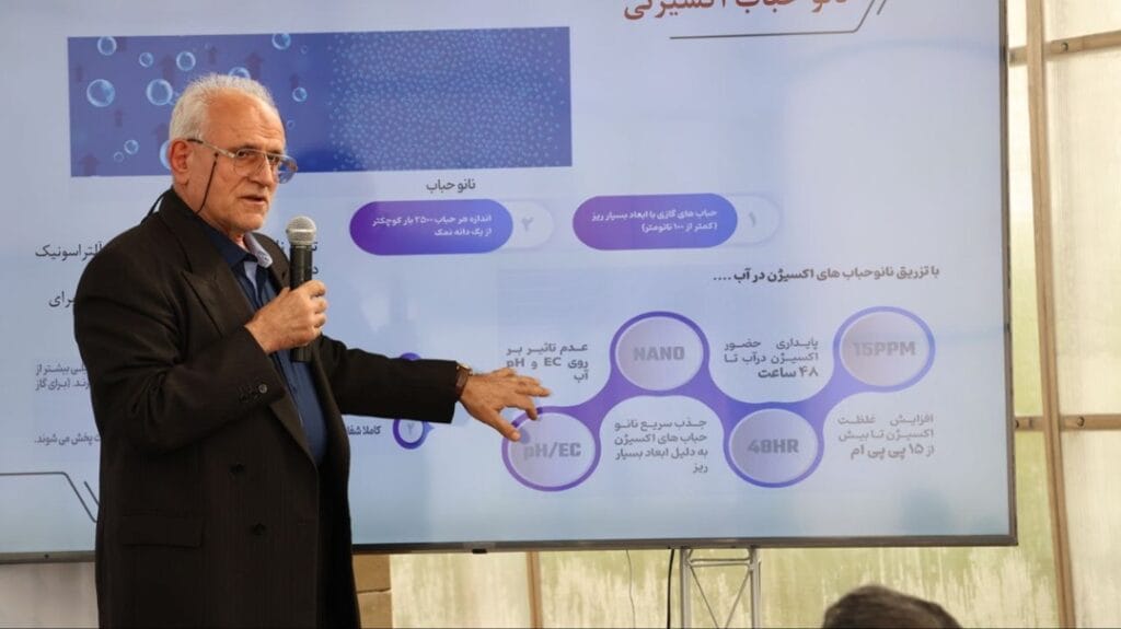 او افزود: تولید نانو حباب اکسیژنی با ارتعاشات آلترآسونیک دارای فرکانس بالا است که به راحتی از منافذ میکرونی ریشه عبور کرده و به درون گیاه برای فعل انفعالات می‌رود.